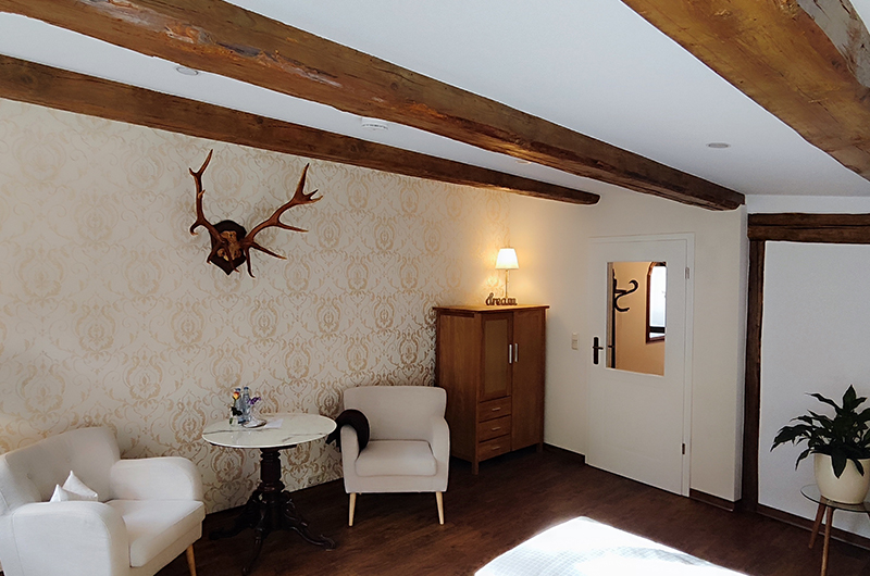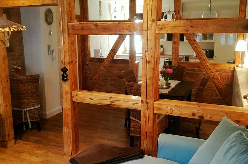 Beim Umbau 2021-2023 wurden das Fachwerk und die Lehmwände wieder sichtbar gemacht.