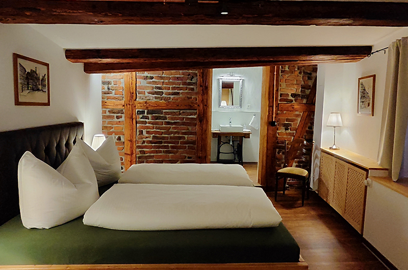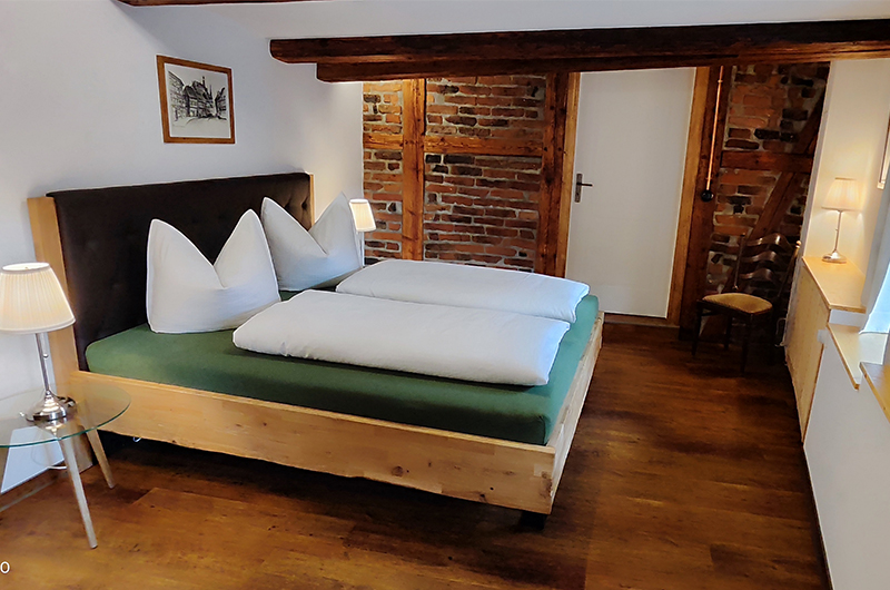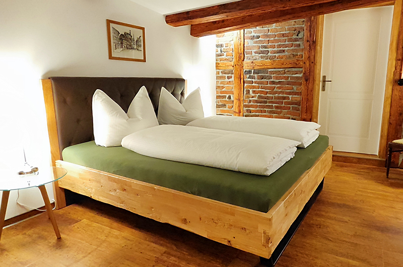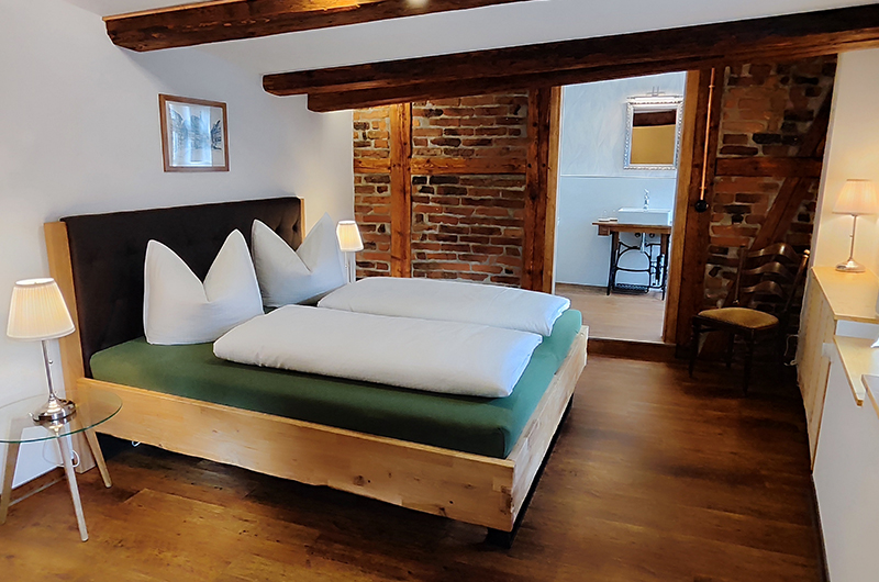 Über einen kleinen Flur mit Garderobe gelangt man in den Schlaf-Wohnbereich mit großem Doppelbett und im Anschluss ins Badezimmer. Als unverwechselbarer Blickfang dienen die Original-Lehm- und Ziegelwände.