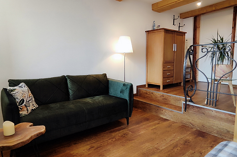 Es verfügt über ein großes Doppelbett und ein gemütliches Sofa.