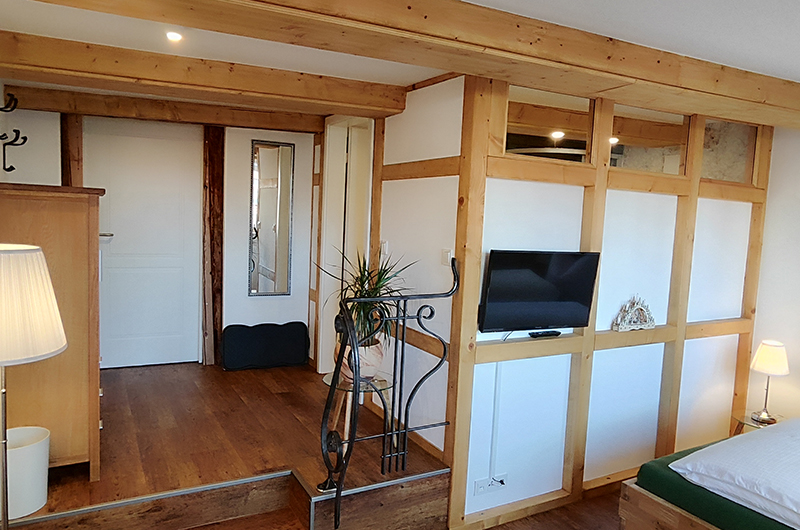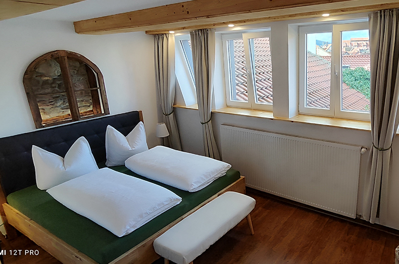 Das helle Zimmer eröffnet einen unverwechselbaren Blick über die Dächer von Wernigerode. Vom Eingang aus gelangt man direkt in das Badezimmer und in den Schlaf-Wohnbereich.