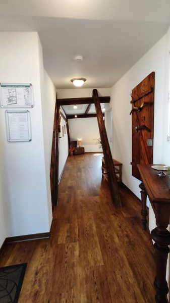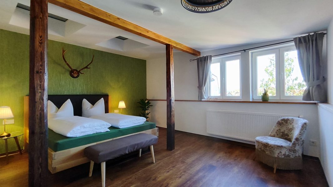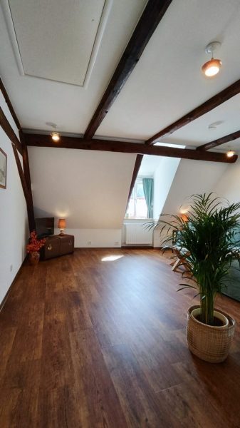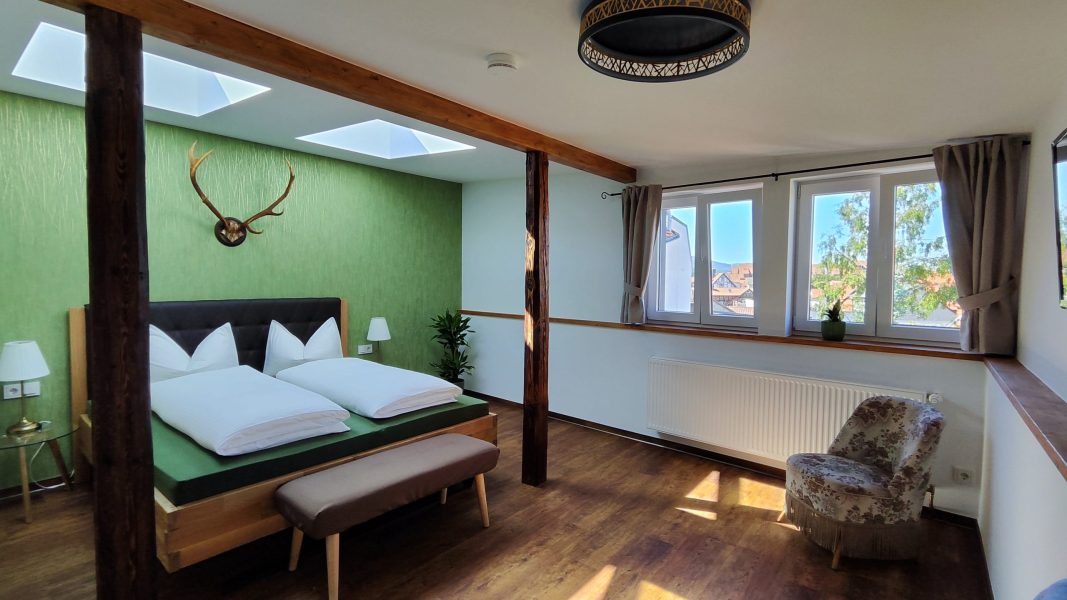 Das Schlafzimmerer liegt ruhig zum Innenhof. Es bietet eine unverwechselbare Sicht über die Dächer von Wernigerode. Im Sommer kann man den Sonnenuntergang genießen.